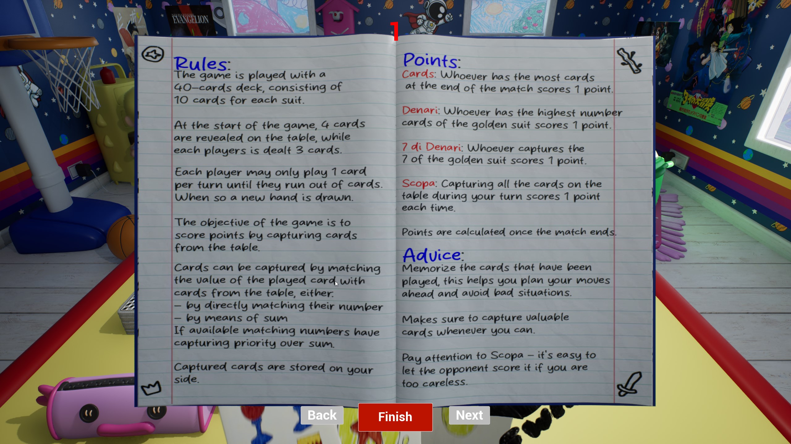 Slicopa is based upon a traditional italian card game called "Scopa", a game in which players each turn are required to play one of the three drawn cards, the objective is to capture valuable card types on the board, clearing it grants a point called scopa.